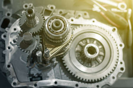 the repair of a gearbox in a car workshop. the insides of the manual transmission. Close up