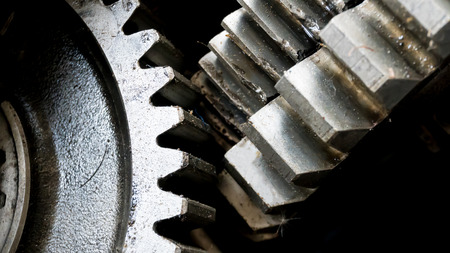 Close-up of gear wheels in a machine, industrial background.