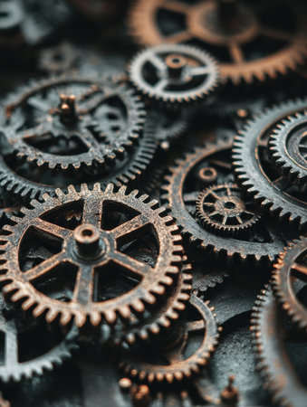 This close-up image features a stunning array of metallic gears, showcasing intricate details and a steampunk aesthetic, perfect for technology or industrial themes.