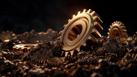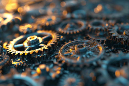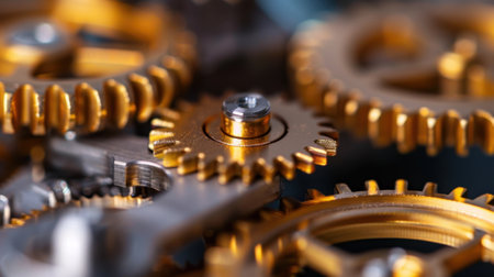Golden gears turning against dark contrast background create striking visual. intricate details of gears stand out, evoking sense of industrial elegance and mechanical precision