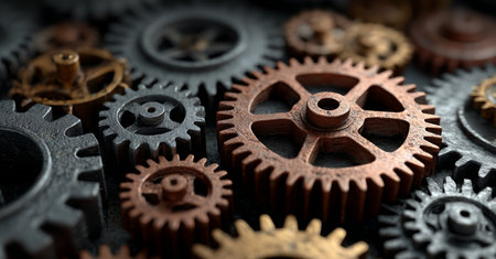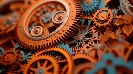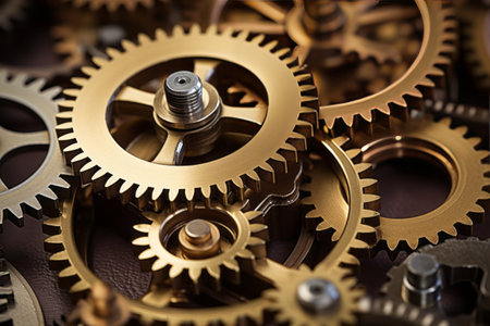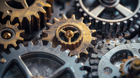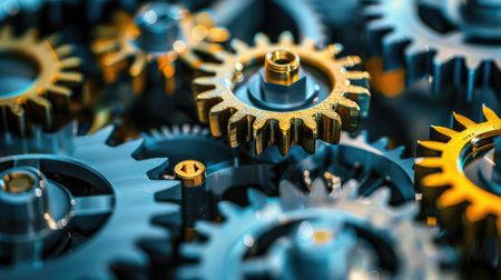 Close up view of complex interlocking industrial gears working together in a seamless mechanism, showcasing the beauty of engineering and precision