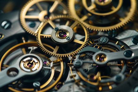 This close-up image showcases intricate metallic gears and cogs, highlighting the precision and complexity of modern machinery. The soft lighting emphasizes the fine details and craftsmanship, evoking a sense of technological advancement.