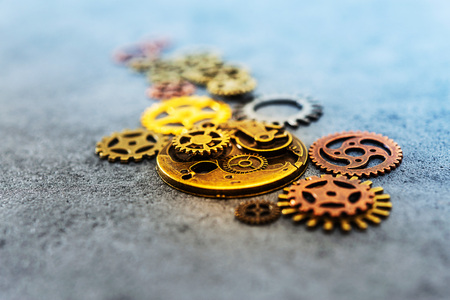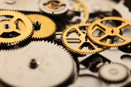 Metal cogwheels and gears working together in a complex and precise mechanism