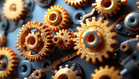 Interlocking gears and cogs in perfect alignment, symbolizing seamless engineering and teamwork