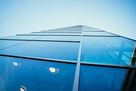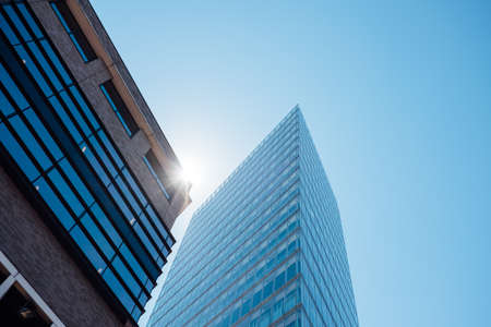 Bottom view of office building window close up with sunrise, reflection and perspective. Modern architecture with sun ray. Glass facade on a bright sunny day with sunbeams on the blue sky.