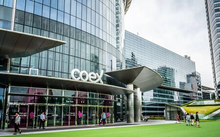 Seoul Korea , 20 September 2019 : Coex shopping mall entrance with people and sign in Gangnam district Seoul South Korea