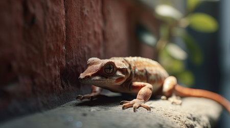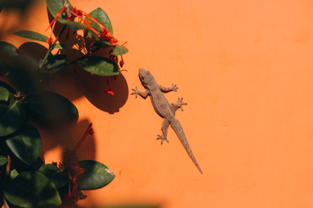 Close up shot of small lizard on orange wall with green plant leaves. Gecko lizard walking on house fence