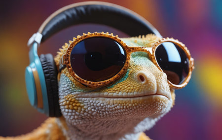 A lizard is sporting goggles and sunglasses for vision care and underwater activities, along with audio headphones for style and personal protective equipment