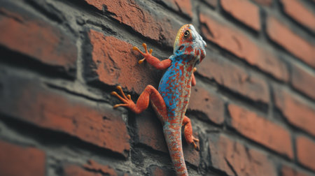 This vibrant image showcases a colorful lizard skillfully climbing a rustic brick wall, highlighting its intricate patterns and vivid colors.