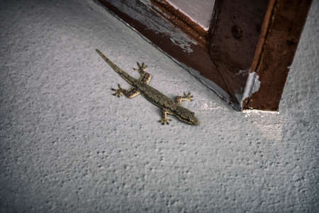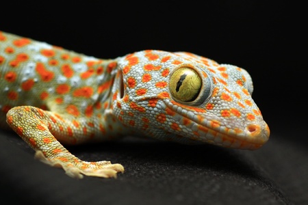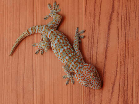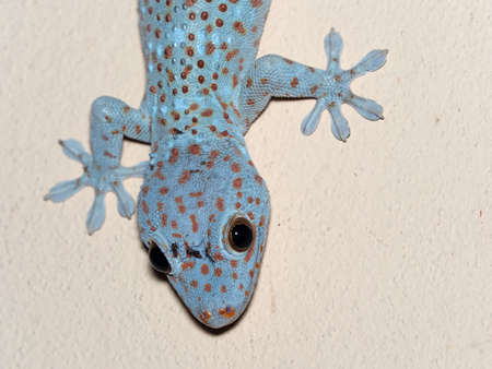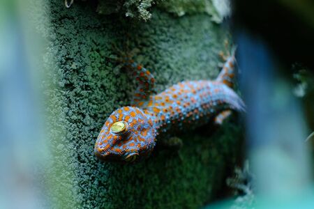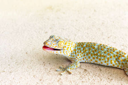Close up of Tokay Gecko (Gekko gecko) climbing wall. Tokay is a large crepuscular arboreal gecko native Southeast Asia.