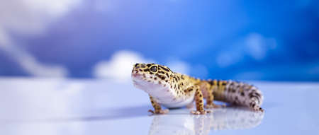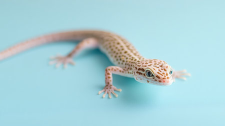 A leopard gecko with a spotted pattern moves across a smooth blue surface showcasing its unique colors and characteristics.
