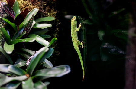 green male giant day gecko lizard.is a diurnal species of gecko. It lives on the eastern coast of Madagascar and typically inhabits rainforests and dwells on trees