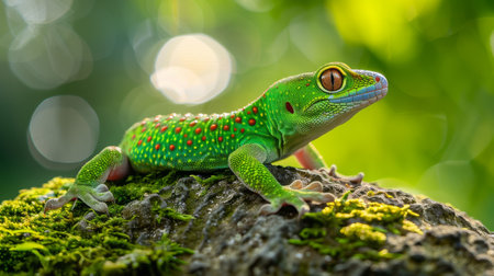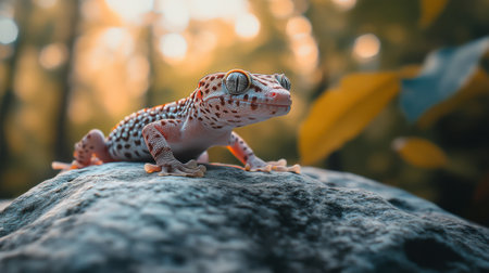 A colorful gecko perched on a rock in a forest during the golden hour, showcasing intricate patterns and textures