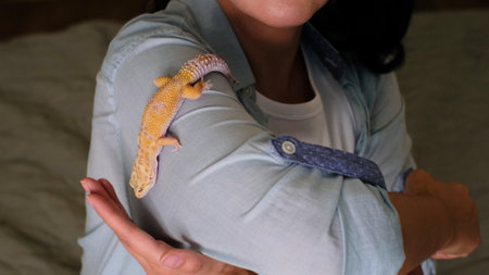 gecko relaxes in the palms of its caretaker, symbolizing the peaceful relationship between humans and animals. This scene captures the essence of companionship and responsibility in pet care.