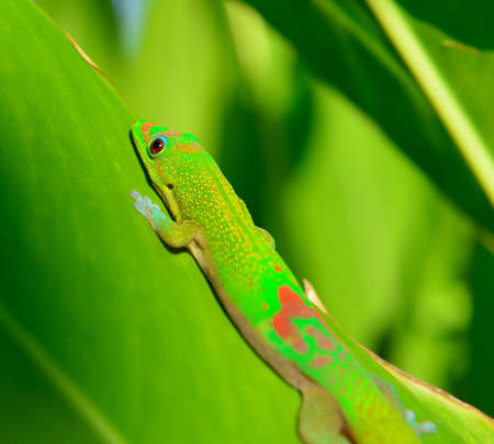 A common gold dust day gecko with its bright green color and red and blue spots is a common sight in tropical climates.