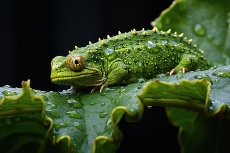 A detailed close-up shot captures a small, bright green lizard delicately perched on a lush, green leaf adorned with morning dew. The image showcases intricate details of the lizard's scales and the leaf's texture, creating a visually appealing and nature-focused composition. Ideal for nature documentaries, websites, or educational materials.