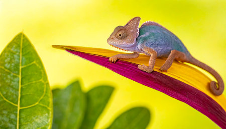 Vibrant Close up of a Colorful Gecko Surrounded by Vivid Pink and Blue Tropical Leaves Exotic Wildlife Concept AI Generative