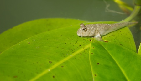 A macro closeup shot of a tiny brown gecko lying on a green leaf