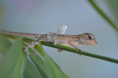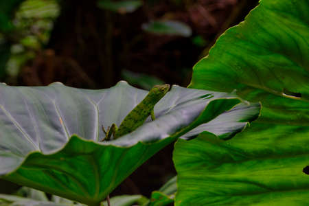 Curious forest lizard, resting on a green leafy plant and keeping watch on his surroundings in a wilderness area of Thailand