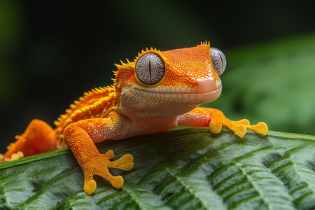 Close Up of a Vibrant Orange Crested Gecko Resting on Lush Green Leaves in a Moist Environment AI Generative