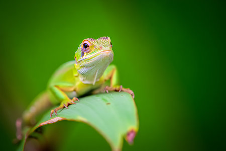This captivating close up shot showcases a baby basilisk lizard resting on a vibrant green leaf The lizards intricate details are emphasized with its captivating eyes and textured scales The vibrant green backdrop enhances the natural beauty of the animal creating a striking contrast The lizard is positioned front and center on a leaf with a soft green background enhancing the natural beauty of the subject It offers a glimpse into the fascinating world of reptiles and their ability to camouflage with their environment The background is naturally blurred due to the shallow depth of field