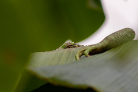 Exotic green tropical lizard hiding in lush fern - Selective focus