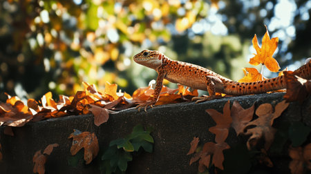 A vibrant lizard rests on a stone surface surrounded by colorful autumn leaves, highlighting its unique patterns in a natural setting filled with tranquility.