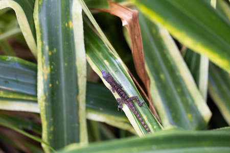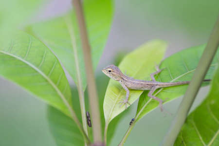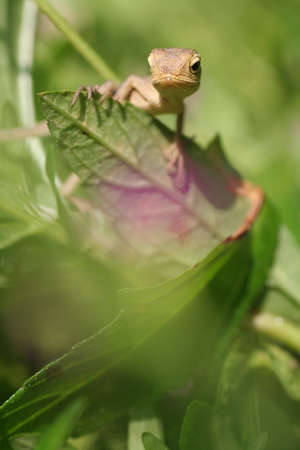 Oriental garden lizard is hiding between green tropical leaves. Selective focus.