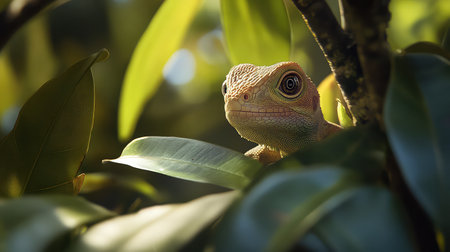 A colorful lizard quietly peers through lush green leaves in a vibrant rainforest, highlighting the beauty of wildlife and the intricacies of nature.