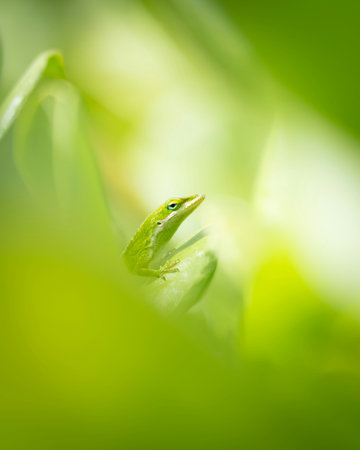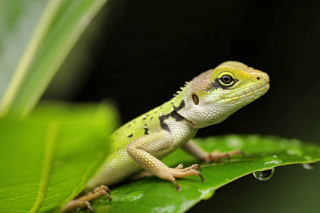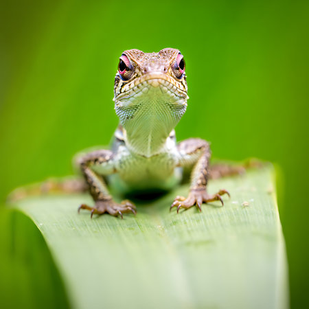 This captivating close up shot showcases a baby basilisk lizard resting on a vibrant green leaf The lizards intricate details are emphasized with its captivating eyes and textured scales The vibrant green backdrop enhances the natural beauty of the animal creating a striking contrast The lizard is positioned front and center on a leaf with a soft green background enhancing the natural beauty of the subject It offers a glimpse into the fascinating world of reptiles and their ability to camouflage with their environment The background is naturally blurred due to the shallow depth of field
