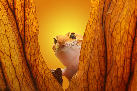 Leopard Gecko on yellow background.Leopard gecko lizard, close up macro