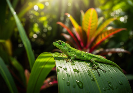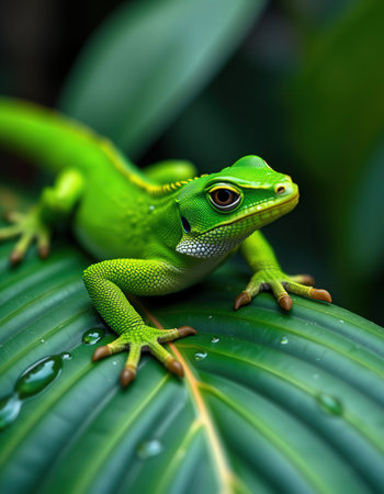 A detailed close-up shot captures a small, bright green lizard delicately perched on a lush, green leaf adorned with morning dew. The image showcases intricate details of the lizard's scales and the leaf's texture, creating a visually appealing and nature-focused composition. Ideal for nature documentaries, websites, or educational materials.