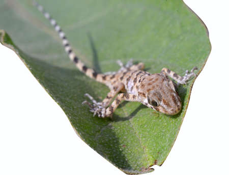One Small Gecko Lizard and Green Leaf on a Colored Background