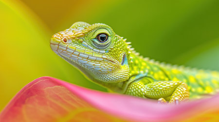 Vibrant Close up of a Colorful Gecko Surrounded by Vivid Pink and Blue Tropical Leaves Exotic Wildlife Concept AI Generative