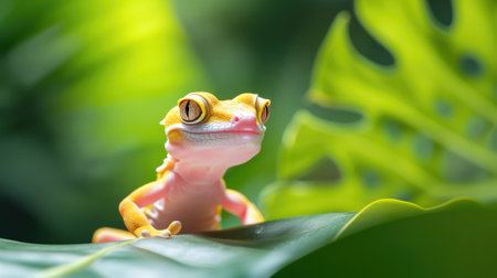 This stunning close-up features a colorful frog resting on a green leaf, highlighted by soft, vibrant light. The scene captures the vibrant essence of nature.