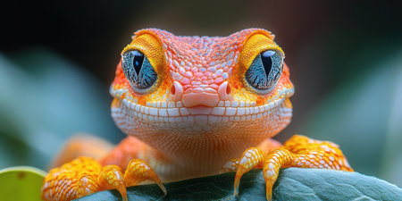 Close Up of a Vibrant Orange Crested Gecko Resting on Lush Green Leaves in a Moist Environment AI Generative