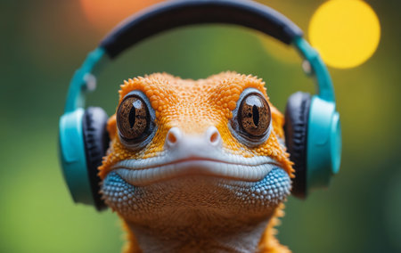 A scaled reptile, known as a lizard, is wearing headphones and smiling in a closeup photo capturing its terrestrial features through macro photography