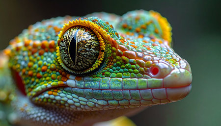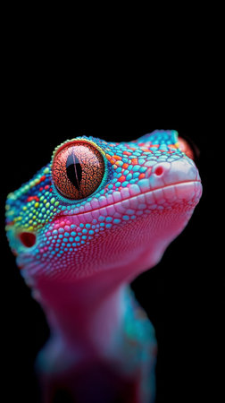 Vibrant close up of a colorful gecko showcasing intricate patterns and textures against a dark background, illustrating the beauty of wildlife and nature