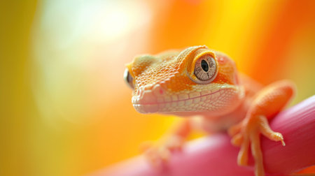 A close up view of a gecko showing its vivid orange, blue, and yellow patterns. The reptiles large eyes are captivating, reflecting light in an intriguing manner.