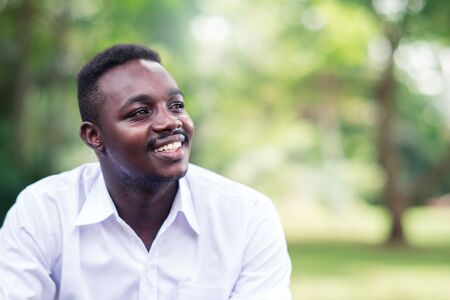 African business man in white shirt smiling and sitting outside with green trees on background.