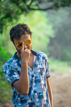 Young indian man showing expression over nature background
