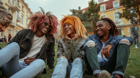 Friends gathered on grass, sharing laughs and conversation in a joyful outdoor scene