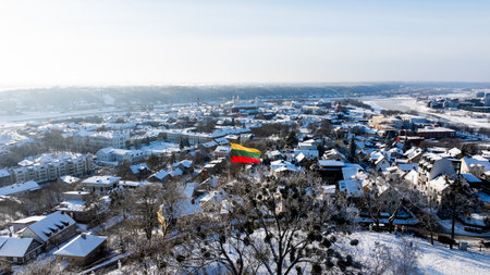 A large Lithuanian tricolor flag flies in the wind above a snow-covered Kaunas cityscape, showing winter rooftops and historic buildings in bright cold sunlight.