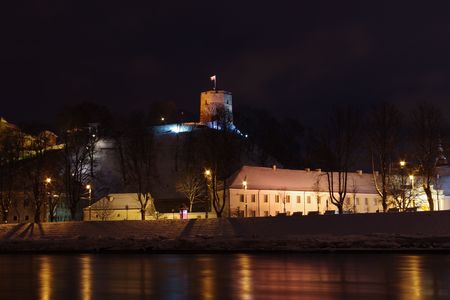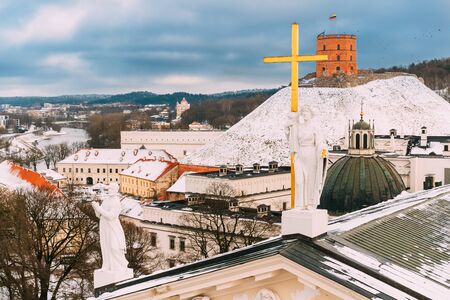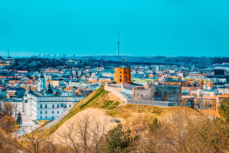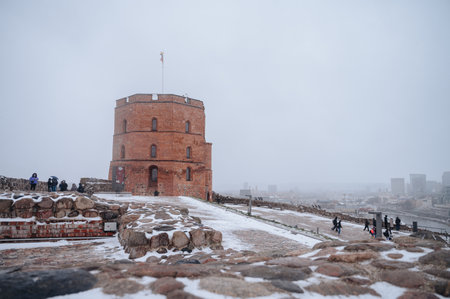 The historic tower of Gediminas on a hilltop in the Old Town of Vilnius at winter. Lithuania