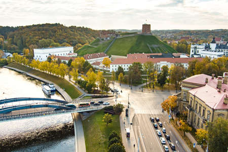 Beautiful Vilnius city panorama in autumn with orange and yellow foliage. Aerial evening view. Fall city scenery in Vilnius, Lithuania