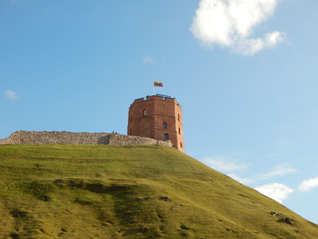 Gediminas Tower or Castle, the remaining part of the Upper Medieval Castle in Vilnius, Lithuania with Lithuanian flag