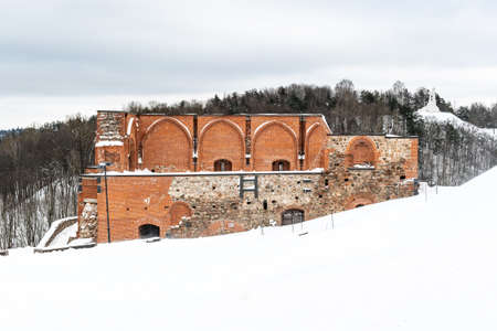 Part of Gediminas Tower or Castle, the remaining part of the Upper Medieval Castle in Vilnius, Lithuania with three crosses hill in winter day with snow