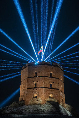 Vilnius, Lithuania - January 26 2023: Vilnius Light Festival. Gediminas tower or castle with Lithuanian flag in winter with snow and laser lights in the sky, vertical