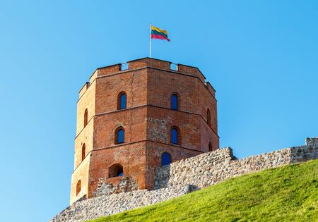 Gediminas Tower or Castle, the remaining part of the Upper Medieval Castle in Vilnius, Lithuania with Lithuanian flag on the top