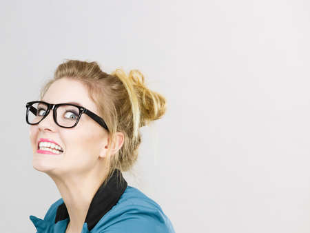 Crazy bizarre business woman or teacher wearing nerd eyeglasses. Female being energetic motivated, wide angle view.